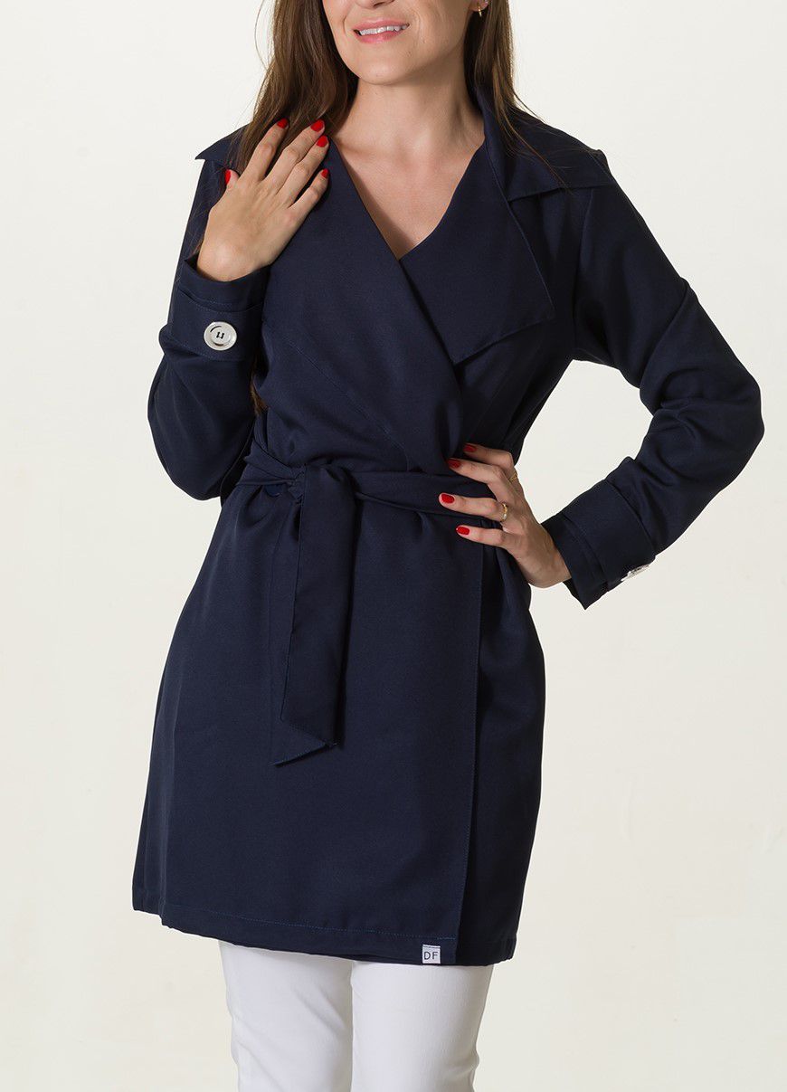 Jaleco confeccionado em gabardine, com faixa de amarra na cintura, o que permite um ajuste perfeito na cinura.