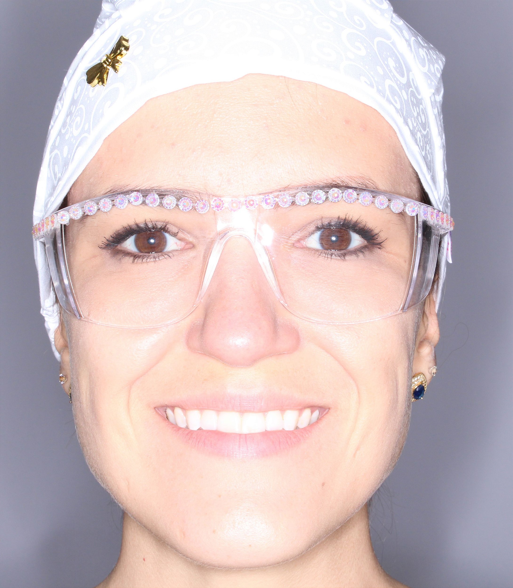 Óculos de proteção com detalhes em strass, disponível em verde, transparente e dourado. São pedras furta cor, ou seja, brilham e alteram a tonalidade conforme a luz.